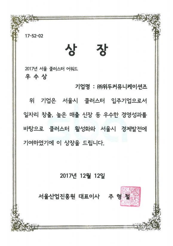 서울클러스터 어워드 우수상 페이지 정보 작성자 WeDu 댓글 0건 조회 6,855회 작성일 19-05-30 19:34 본문 2017-12-12 우수상 17-52-02 서울클러스터 어워드 서울산업진흥원 대표이사 주형철 List Previous서울특별시장 표창장 19.05.30 Next산업통상자원부 표창장 19.05.30