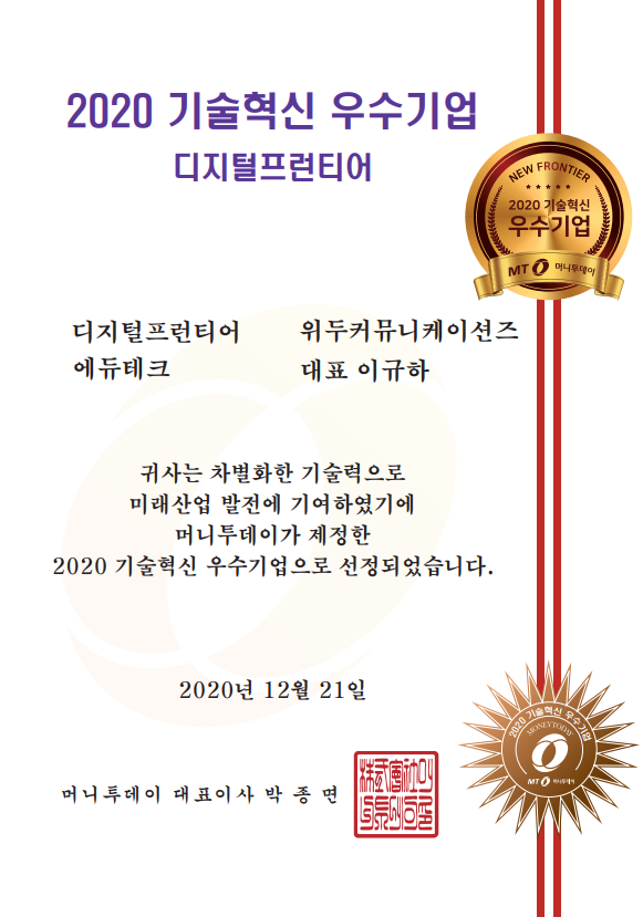 2020 기술혁신 우수기업 페이지 정보 작성자 WeDu 댓글 0건 조회 6,046회 작성일 21-12-31 12:58 본문 2020-12-21 2020 기술혁신 우수기업 디지털프런티어 에듀테크 머니투데이 대표이사 List Previous2020 소년한국 우수 어린이 도서 선정 21.12.31 Next2020 서울산업진흥원 2020 DMC어워드 21.12.31