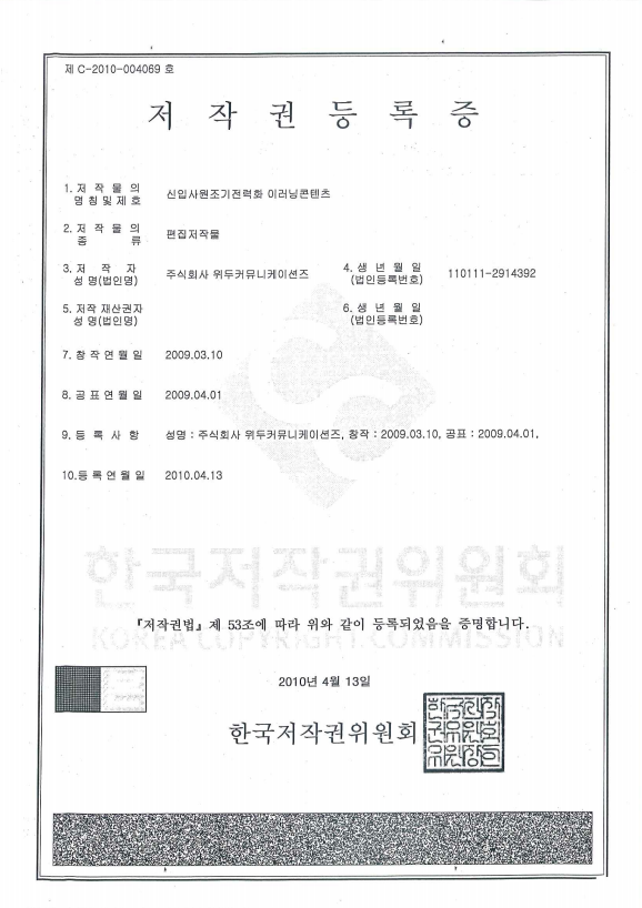 [한국/저작권] 신입사원조기전력화 이러닝 콘텐츠 페이지 정보 작성자 WeDu 댓글 0건 조회 6,018회 작성일 19-05-30 19:01 본문 2010-04-13 저작권 C-2010-004069 신입사원조기전력화 이러닝콘텐츠 / 편집저작물 List Previous[한국/저작권] 리안의 수학 모험 19.05.30 Next[한국/상표] OLL 41류 19.05.30
